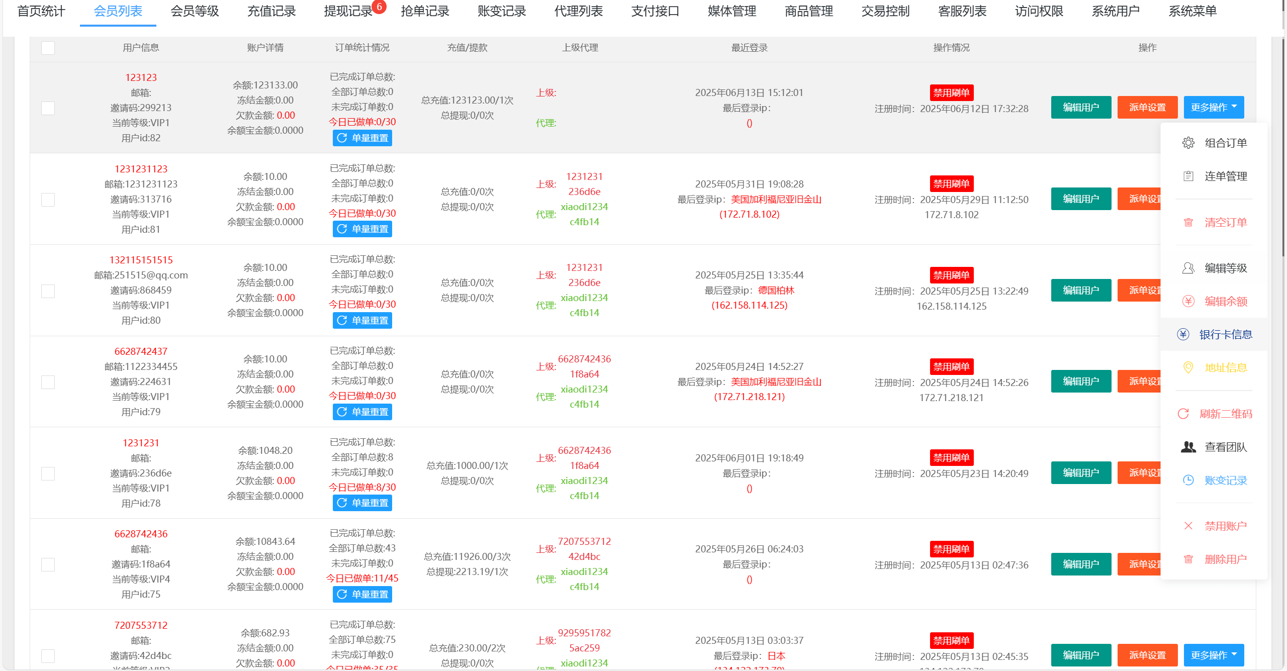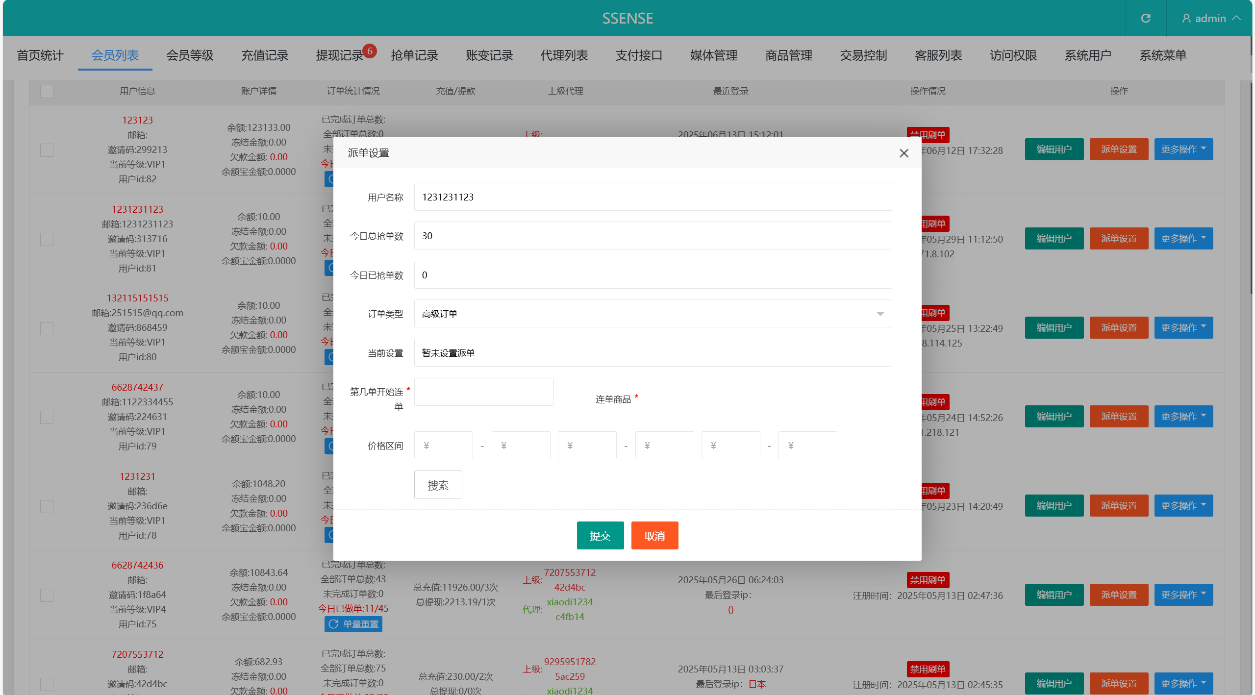 系统功能:派单(支持幸运单,高级单),连单卡单,信用分,订单重置等功能